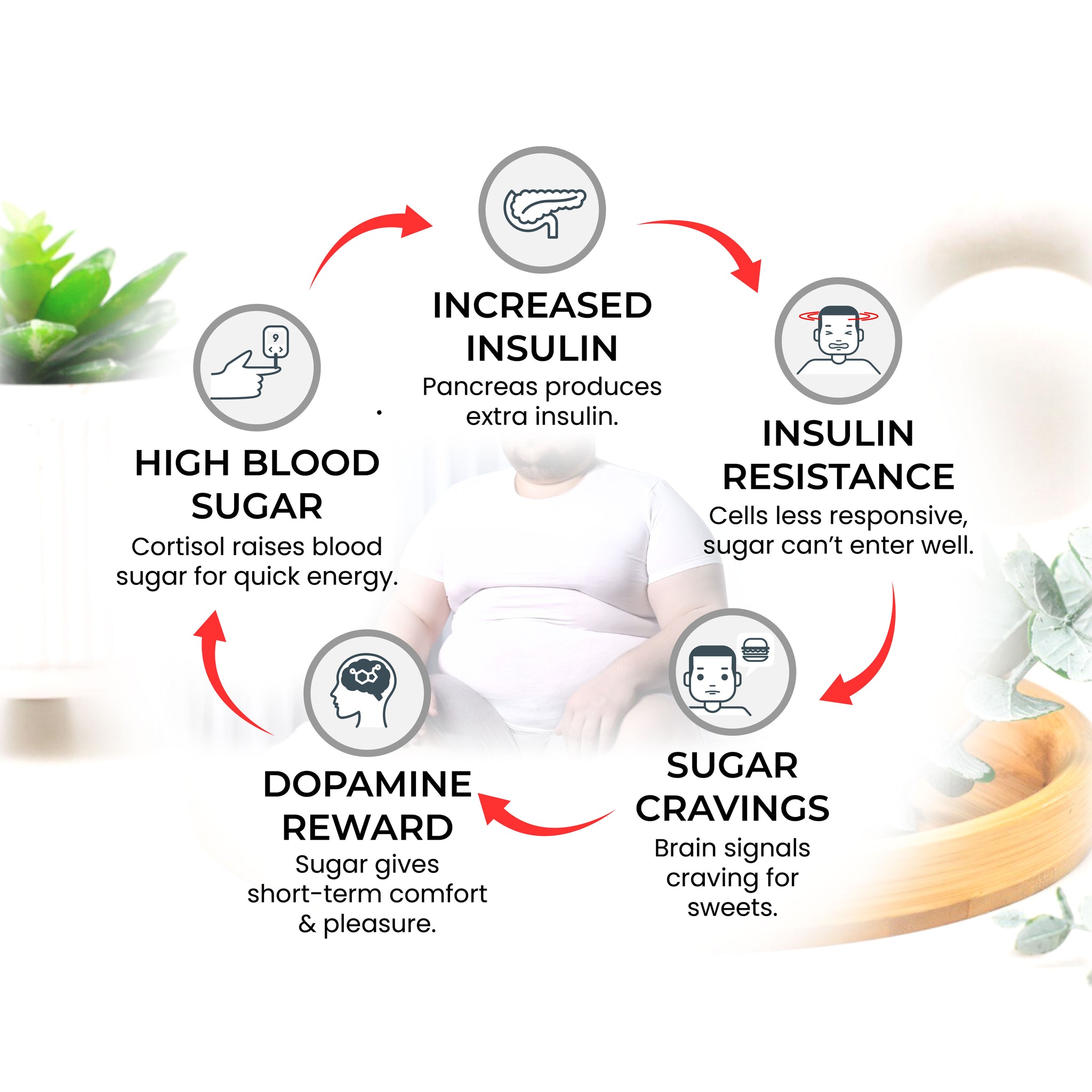 Disrupted hunger hormones – Elevated cortisol disrupts leptin and ghrelin balance, weakening appetite control and driving overeating.